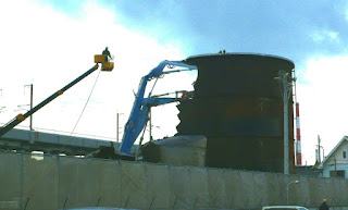 後記; ここで2回にわたって紹介したので、ついでにもう一度紹介しておきます。出光興産徳山製油所の旧アスファルトタンク解体工事でついに最後の1基が解体されています。時代の流れとはいえ、衰退していく石油精製工業の象徴のように見えます。