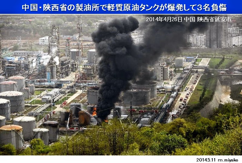 ■ 2014年4月26日(土)朝、中国陝西省(せんせい/シャンシ-省)延安市(えんあん/イェンアン-市)の製油所にある貯蔵タンクが爆発・火災を起こした。事故があったのは、中国北西部にあたる延安市の陝西延長石油(Shaanxi