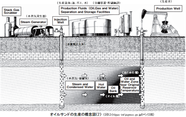 ■ アルバータ州のオイルサンドの生産の概念図はつぎのとおりである。今回のセキュア・エナジー社の施設はオイルサンドの水蒸気攻め法(Steam Assisted Gravity Drainage)による関連設備ではないかと思われる。