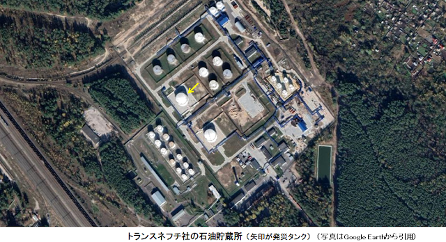 ■ トランスネフチ社の石油貯蔵所で火災があったのは、容量10,000KLのディーゼル燃料タンクだという。軍事施設で火災があったのは、5,000KLの燃料タンクだという。