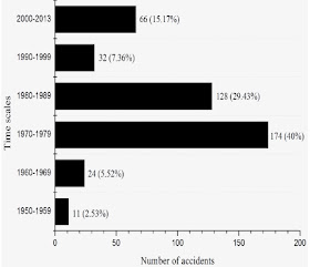 ● 1951年~2013年の63年間に435件の火災・爆発事故があったというので、平均すると6.9件/年である。貯蔵タンクに限ると、事故件数は112件であり、平均すると1.7件/年となる。一方、「貯蔵タンクの事故の研究」(2005年5月)では、世界で1960年~2003年の43年間に起こった242件の貯蔵タンクの事故件数について分析しており、これによると、平均は5.6件/年で、2000~2003年の4年間が最も多く、12.7件/年である。